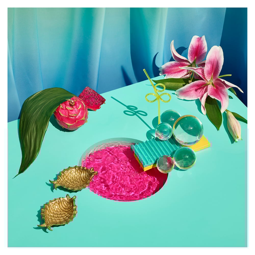 I created a series of dreamy sets where surreal swimming pools are enjoyed by golden sea animals and birds are surrounded by Acapulco chair style elements, tropical vegetation and fruits.