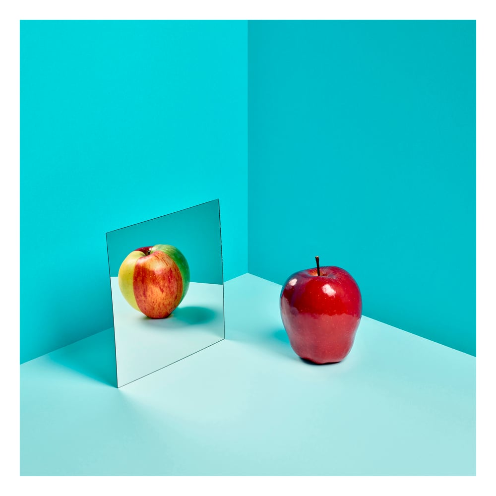 The apple, while being herself, an apple, is reflected as different versions: sometimes a Royal Gala, sometimes a Golden Delicious, sometimes a Granny Smith, etc. In reality she’s a Red Delicious beautiful and shiny apple. An image that can represent some mental issues like Multiple Personality or Bipolar Disorder. But it can also symbolize having trouble with decisions and changing mind about what we want, who we are. At the end, all of them are tasty, beautiful and yummy apples.