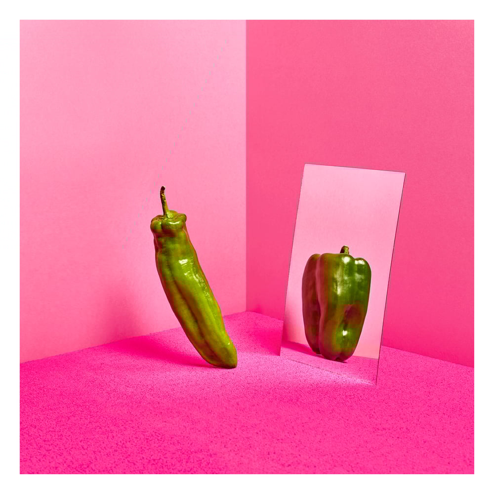 The pepper looks at the mirror and reflects something different to what it really is. A smallest and wider version of himself. Both beautiful, but different.